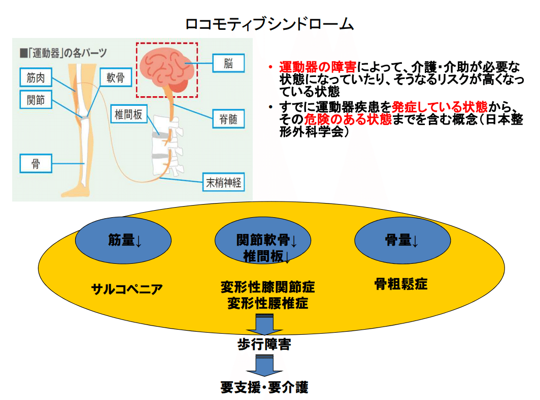 ロコモティブシンドローム(ロコモ)は、運動器(骨・関節・筋肉など)の機能低下により、移動機能が障害される状態を指します。