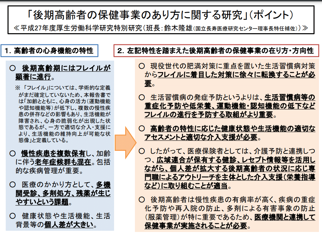 また、フレイル対策も介護保険制度の枠組みに含まれる部分もありますが、必ずしも一体的に行われているわけではありません。