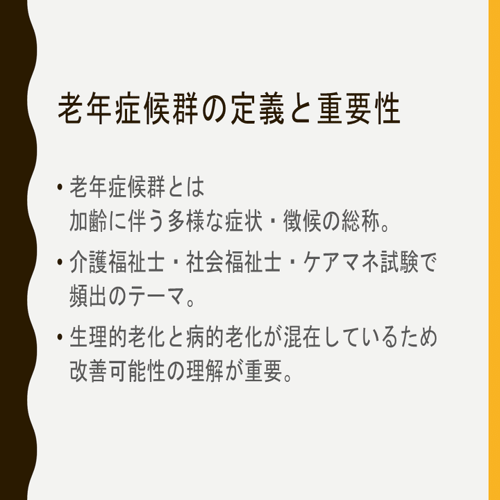 高齢者の状態を正確に把握し、適切なケアを提供するためには、老年症候群に関する知識を深めることが不可欠です。