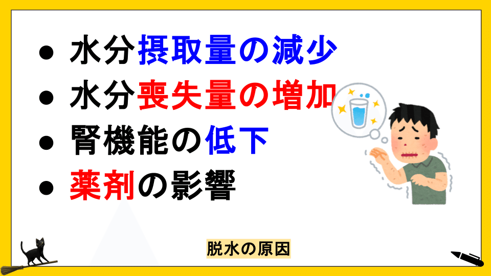発熱、下痢、嘔吐、多汗などにより体内の水分が失われる。腎機能の低下
