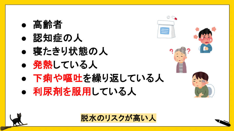 また、喉の渇きを感じにくい、薬の副作用など、様々な要因が重なり、脱水のリスクが高まります。