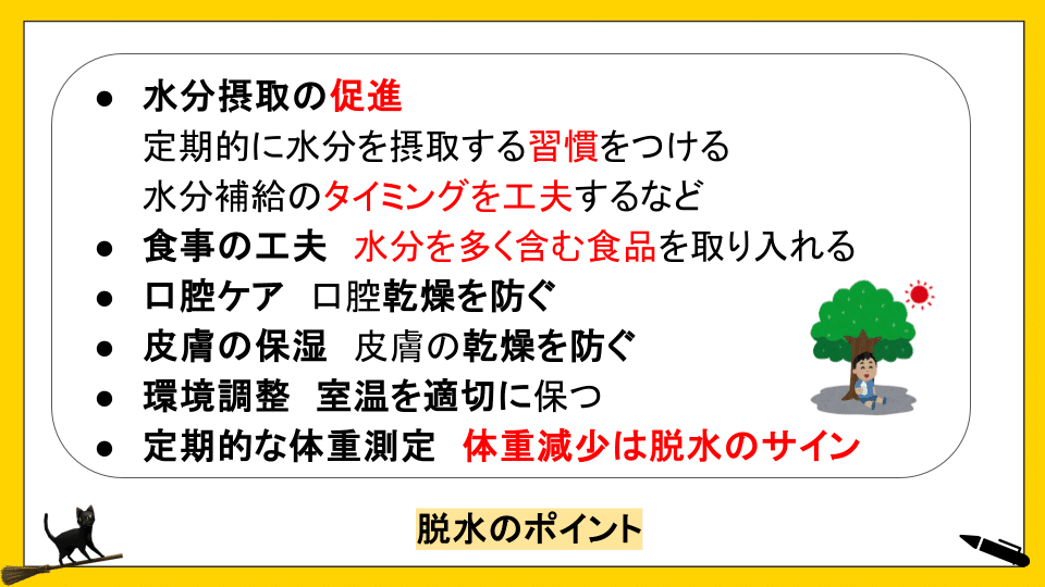 国家試験では、脱水に関する基礎知識だけでなく、実際の介護場面での対応力が問われます。