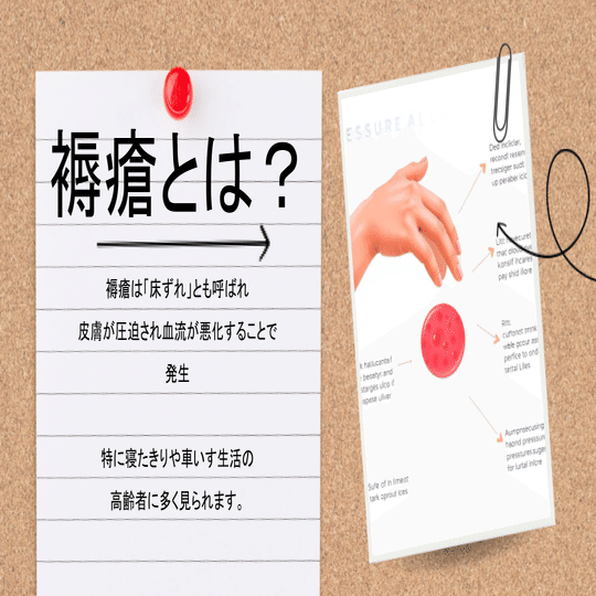 褥瘡は、長時間同じ体勢でいることで、皮膚が圧迫され、血流が悪くなり、組織が壊死してしまう状態です。