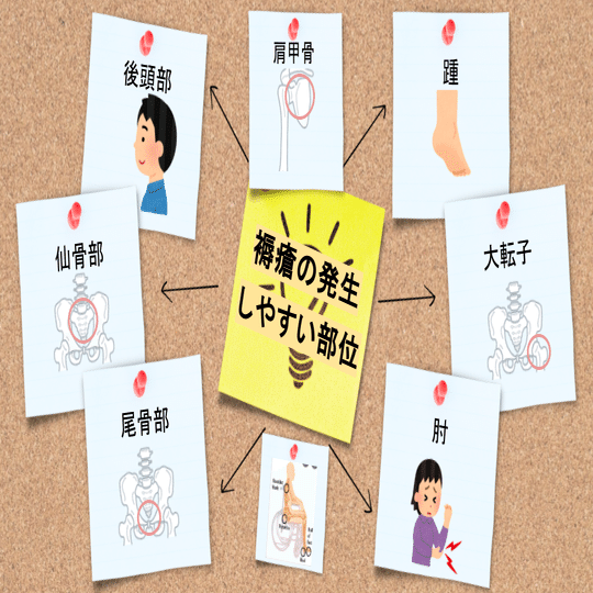 特に、骨が突出している部位にできやすく、仙骨部は、寝ているときに体重がかかりやすく、褥瘡ができやすい部位として知られています。